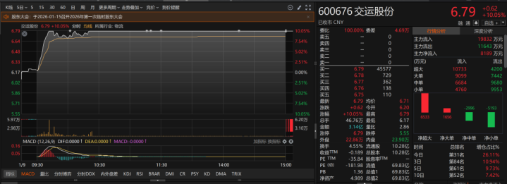 1月9日,交运股份提前异动,开盘快速冲高,在短暂波动后封住涨停。