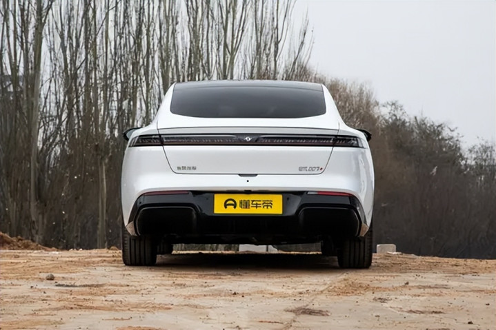 eπ007+的尾部造型延续了车头的简约风格,但视觉层次更为丰富。贯穿式“天际晶格”LED尾灯在夜晚极具辨识度,中间的灯带微微上扬,与车头的“展翼”造型形成呼应。下方扩散器式包围设计配合熏黑处理,进一步强化了整车的运动气息。最引人注目的设计,是其可升降电动尾翼。当车速超过一定阈值时,尾翼自动升起以提升下压力,而在低速时则自动收回,兼顾空气动力学效率与整车视觉完整性。这一设计在同级中少见,既提升了功能价值,也展现了品牌在工程与美学结合上的思考。